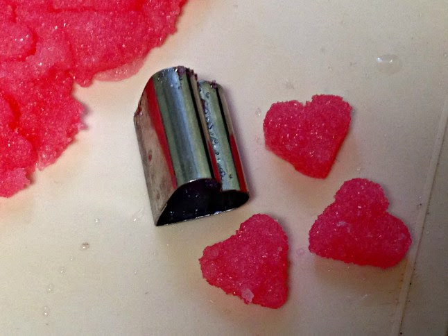 Sekoita yhteen sokeria, hieman kylmää vettä ja halutessasi elintarvikeväriä. Vettä tulee niin vähän, että sokeri on kuin märähköä hiekkaa. Levitä tarttumattomalle alustalle ja ota sydämenmallisella muotilla paloja. Anna palan kuivahtaa hetken ennen nostamista, jottei se murru.